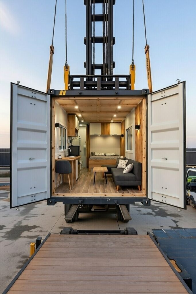 現地でコンテナを開き、クレーンまたはフォークリフトでモジュールハウス本体を引き出します。