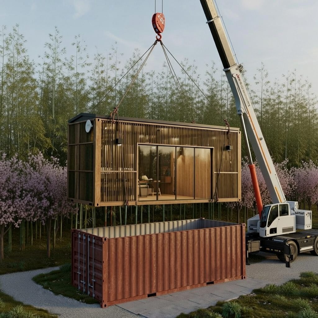 自然に溶け込む美しい佇まいにクレーンで輸送コンテナから設置。