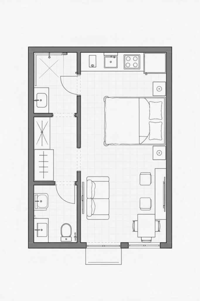 コンパクトながらゾーニングが明確。リビング・キッチン・寝室・バスルームが一体感を持って配置されています。